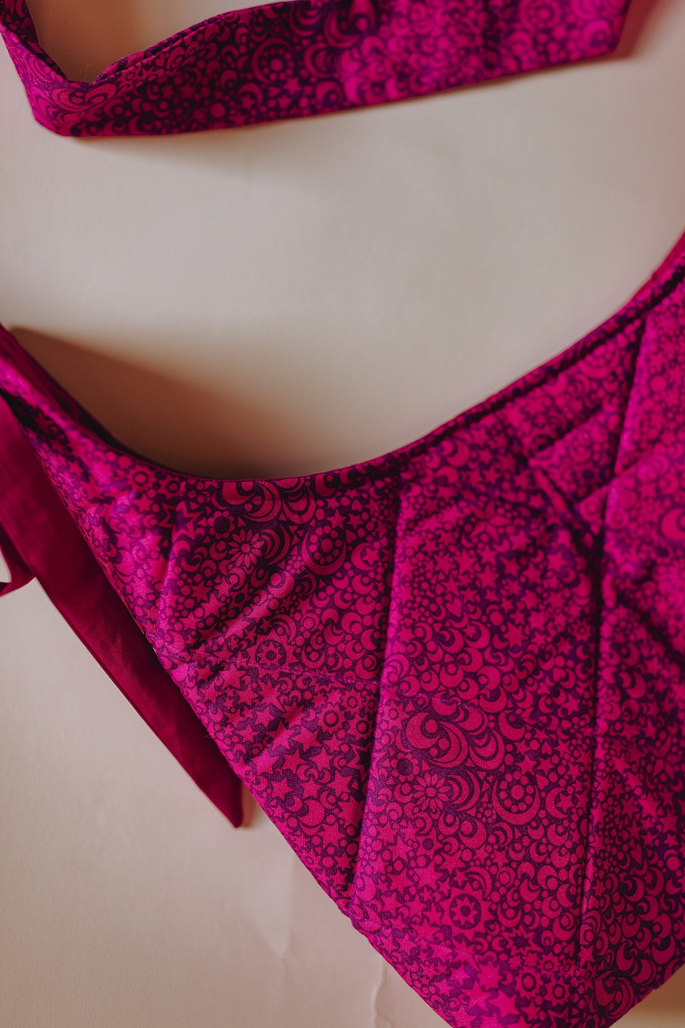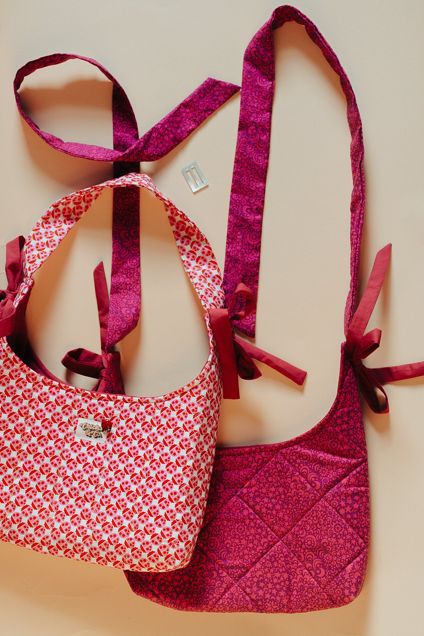 Meet my newest obsession, bags! Handmade and quilted by me. Foam in between fabric for a nice, sturdy look. Hand-sewed mini bows on the sides.