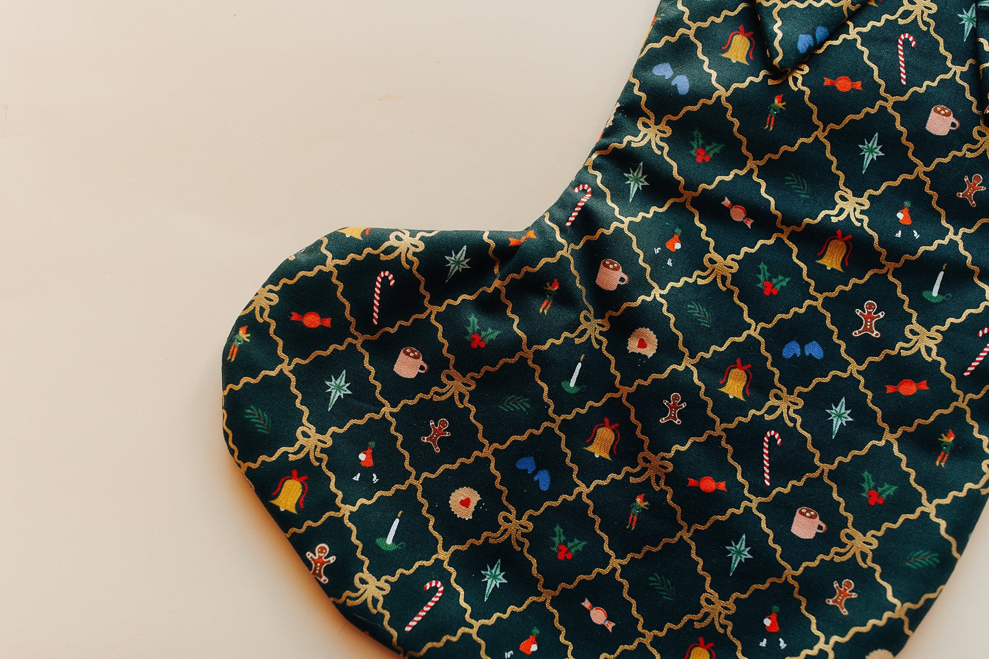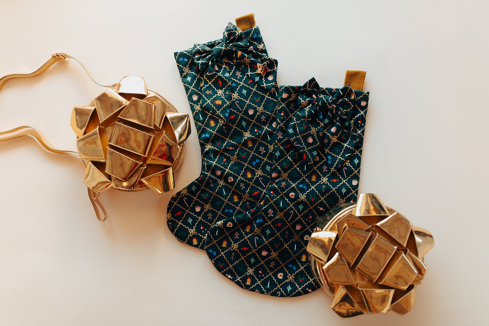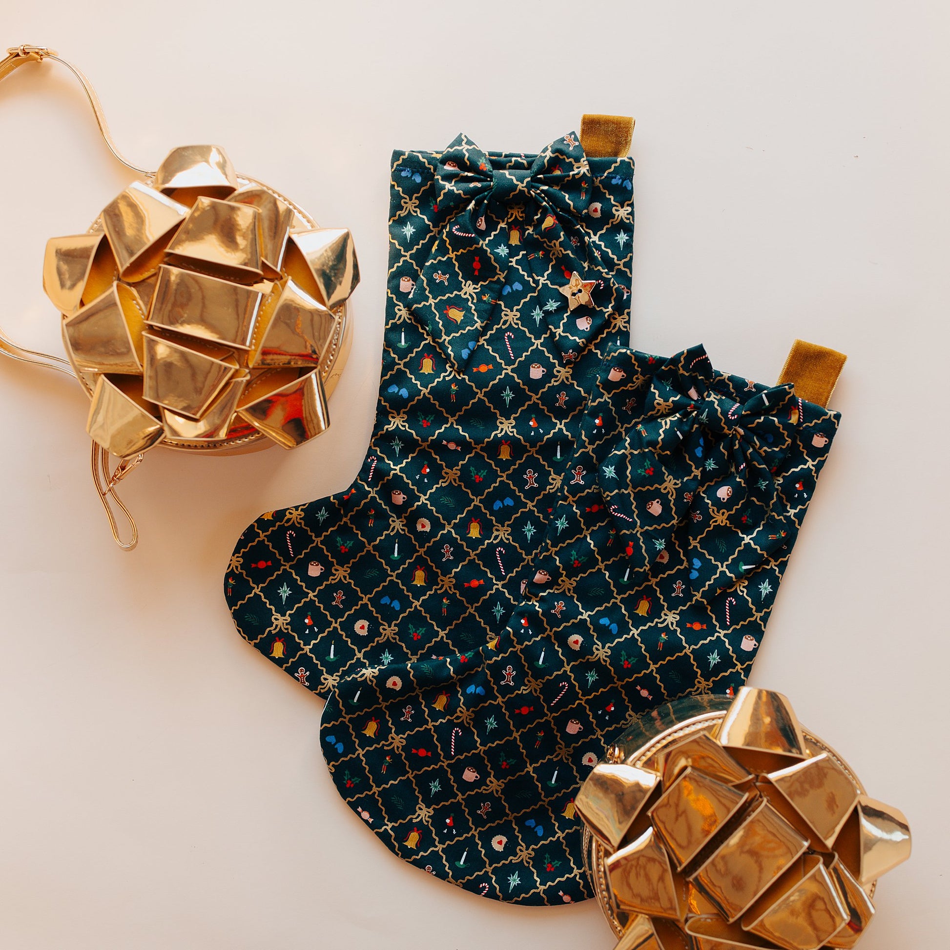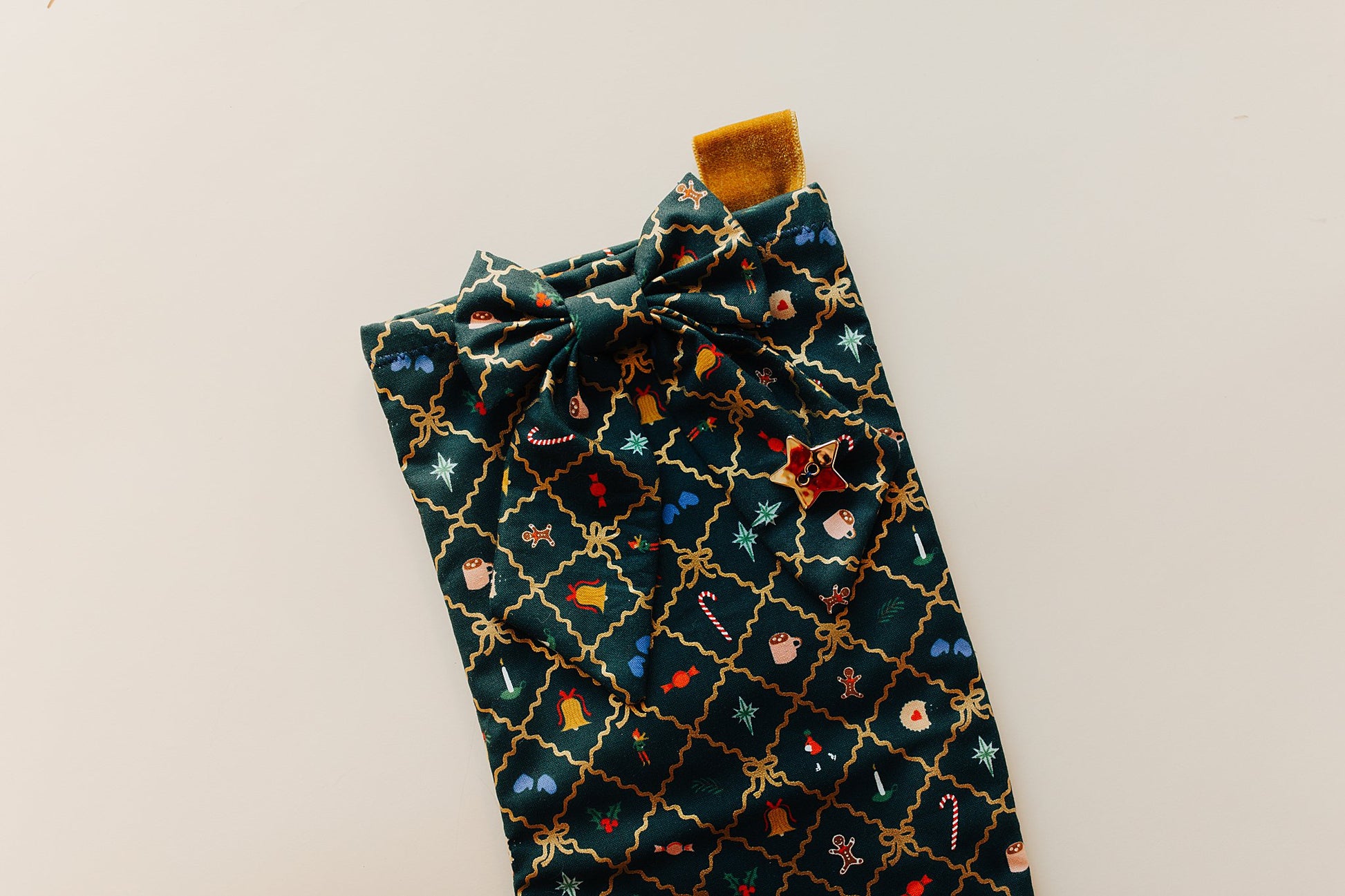 Handmade Christmas stocking, with added bow! Perfect for your mantel. Velvet strap for easy hanging and flannel interior.