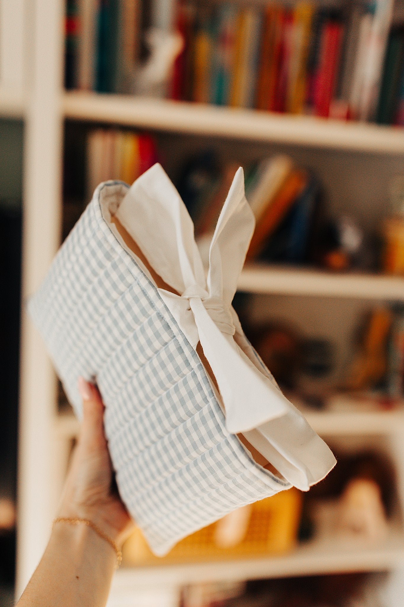 Handmade with love! This adorable quilted Bow Book Sleeve is the perfect companion for readers on the go! Designed to snugly fit books up to 8.5x11 inches, it keeps your favorite reads safe from scratches, creases, and spills. The charming bow detail adds a touch of coquette but also making it as stylish as it is practical.