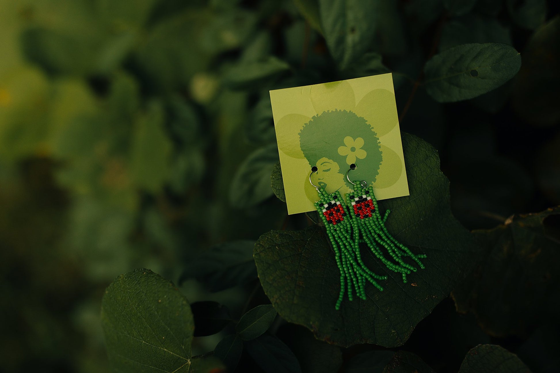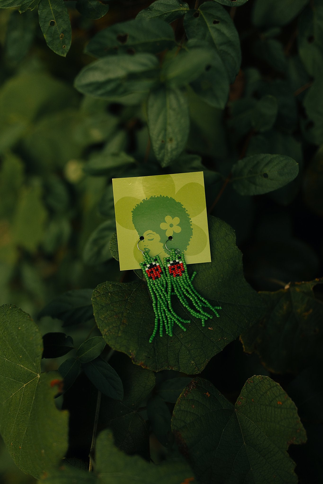 Handmade locally by DLP Designed. Green & red beaded lady bug dangles.