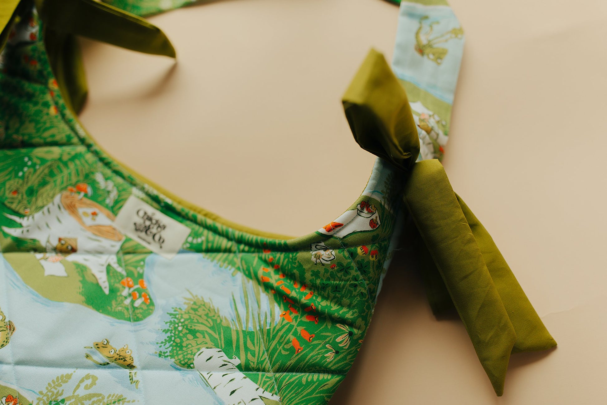 RIBBITING. I cannot with this fabric. Meet my newest obsession, bags! Handmade and quilted by me. Foam in between fabric for a nice, sturdy look. Hand-sewed mini bows on the sides.