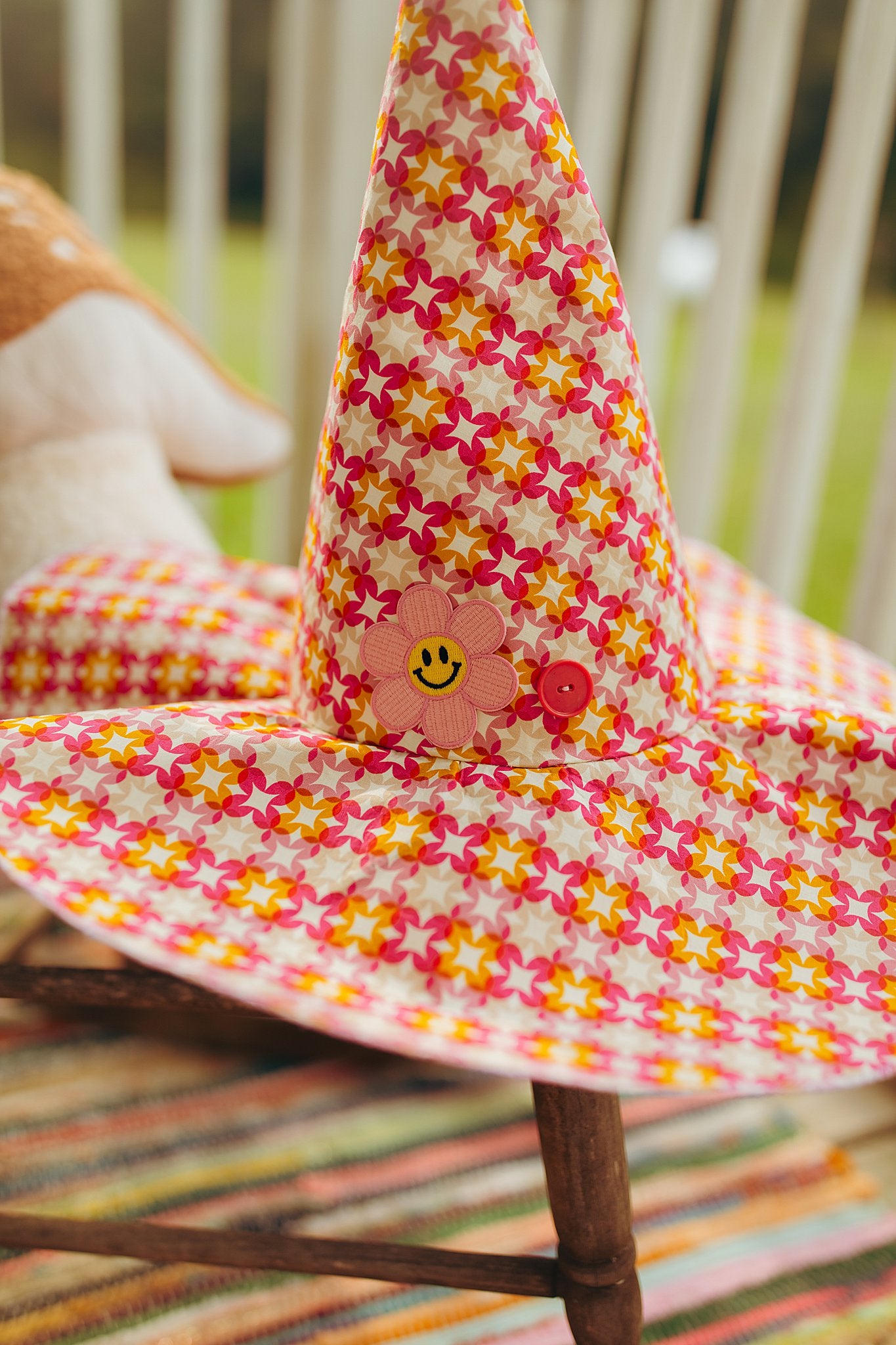 Celebrate spooky season with a witch hat! Handmade by me. Featuring accents of buttons and a whimsical patches!
